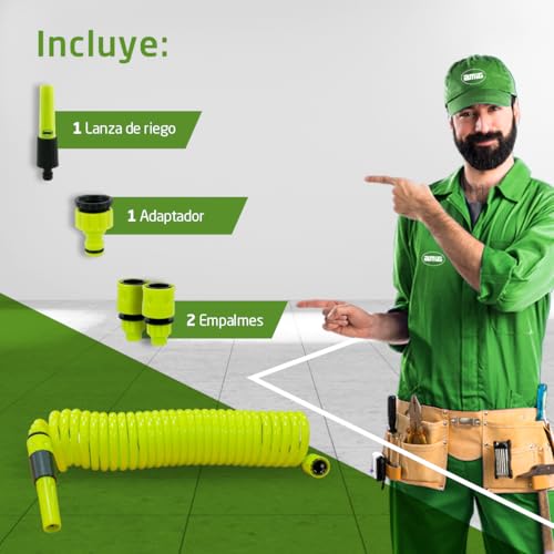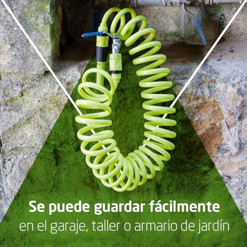 - DISENO PRACTICO: esta manguera en espiral, de 3/8" y 7,5 m de longitud maxima, es perfecta para regar superficies pequenas en jardines, terrazas o balcones. Su diseno extensible permite un manejo comodo y rapido, facilitando la tarea de regar tus plantas. Es una manguera fabricada en polipropileno que no tendras que enrollar ni se enredara. Color: Verde pistacho.