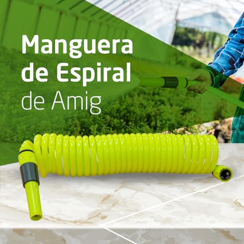 Amig – Manguera en Espiral – Fabricada en Polipropileno – Medida Extensible hasta 7,5 m – Incluye Lanza de Riego, Adaptador y 2 Empalmes – Color: Verde Pistacho