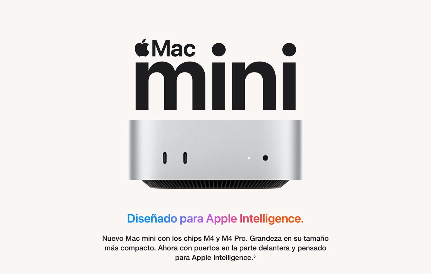 TAMAÑO MINI, POTENCIA MAXI — Con sus 12,7 cm de ancho y de largo, el nuevo Mac mini es una cucada con una potencia que asusta. Está diseñado para Apple Intelligence.* Incluye un innovador chip M4 de alto rendimiento que abre todo un mundo de posibilidades. Y ofrece una amplia gama de puertos, en la parte delantera y trasera.