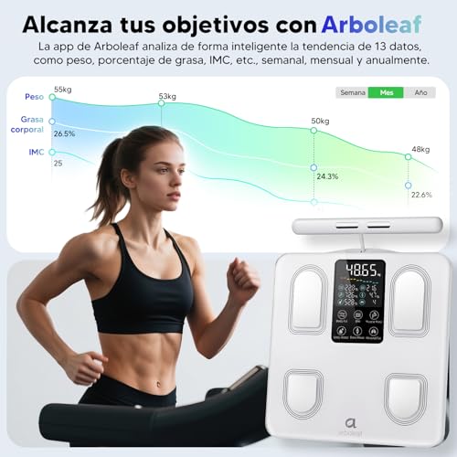 - ?27 datos corporales?Esta balanza peso corporal registra con precision 27 indicadores de salud importantes, como peso, IMC, grasa corporal, masa muscular y otros datos importantes. La bascula inteligente Arboleaf te permite comprender mejor tu salud fisica y es perfecta para quienes se centran en el control de su peso y salud general.