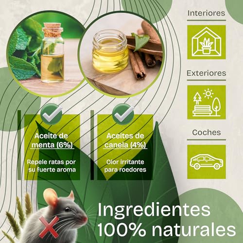 - ? Repelente ratones eficaz sin quimicos ni veneno Este repelente ratones ofrece una alternativa natural a los productos agresivos del mercado. Basta con rociar en zonas de paso, nidos, rincones o entradas para interrumpir el comportamiento habitual de los ratones y evitar su regreso sin causarles dano.