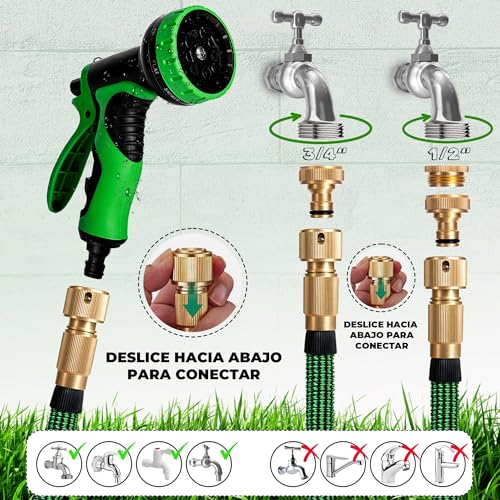 - Accesorios adicionales: Ademas de la manguera de jardin, cada envio incluye, tres juntas de repuesto, un rollo de cinta selladora de teflon para una instalacion perfecta y duradera, un soporte de pared y una bolsa de almacenamiento.