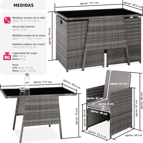 - DISENO DURADERO: Hecho para resistir, este conjunto destaca por su fino trenzado de polirratan, no solo anadiendo un toque elegante a tu jardin, sino tambien asegurando durabilidad frente a las condiciones climaticas. La resistencia a la intemperie garantiza que tu conjunto de jardin se mantenga como nuevo temporada tras temporada.