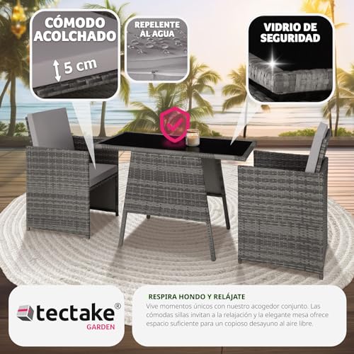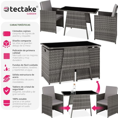 TecTake® Conjunto Jardín Exterior de Ratán y Aluminio, Muebles Jardín Exterior Resistente a la Intemperie, 2 Sillas con Cojines, Mesa Cristal, Apilable, Fundas Extraíbles – Gris