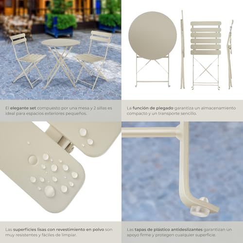 TecTake® Conjunto Muebles Jardín Exterior de Mesa de Bistró y 2 Sillas, Plegables, Tapas Antideslizantes, Mesa y Sillas Terraza Estilo Retro con Estructura de Acero, Ideal Balcones Pequeños – Crema